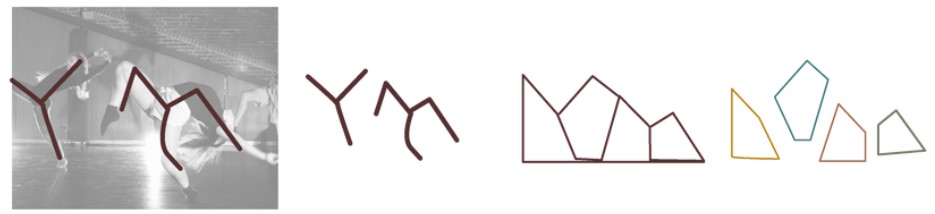 El concepto viene de un análisis previo sobre los movimientos de la danza contemporánea, en este caso escogí una de mis coreografías favoritos. Se analizó cómo es que los bailarines estan en cambios de posiciones constantes pero siempre manteniendo el equilibrio. Como primer punto se geometrizaron estos movimientos logrando figuras irregulares de diferentes alturas unidas por uno de sus puntos